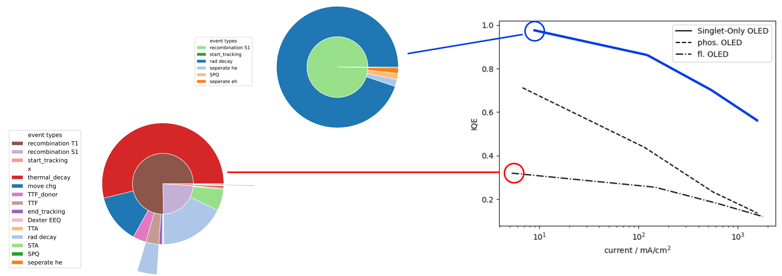 Excitons are formed as singlets or triplets. According to spin statistics, 75% of the excitons formed on fluorescent emitters are triplets, and only 25% are formed in the singlet state. On fluorescent emitters, only singlets can decay radiatively, i. e. emit a photon, while long-lived triplets cannot emit light and potentially cause harm to the system, especially in the blue regime.